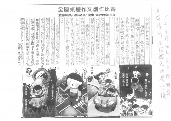 賀~~本校五年忠班晏瑋伶同學榮獲「全國桌遊作文創作比賽」特優獎,並於107年9月26日於交通部領獎。