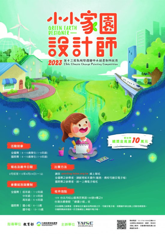 一、由教育部、行政院環境保護署指導,本會主辦之「氣候變遷國中小繪畫創作比賽」迄今已舉辦12屆,累計40國、59,152名學子參與。本屆(第13屆)為呼應聯合國永續發展目標(SDGs)的第11項,以「小小家園設計師」為主題,提升國中小師生關注天然災害對城市造成的損傷,思考如何降低城市垃圾和空氣污染,同時重視社區文化與自然遺產等。此繪畫比賽也呼應第13項,採取氣候行動並提升大眾相關意識。
