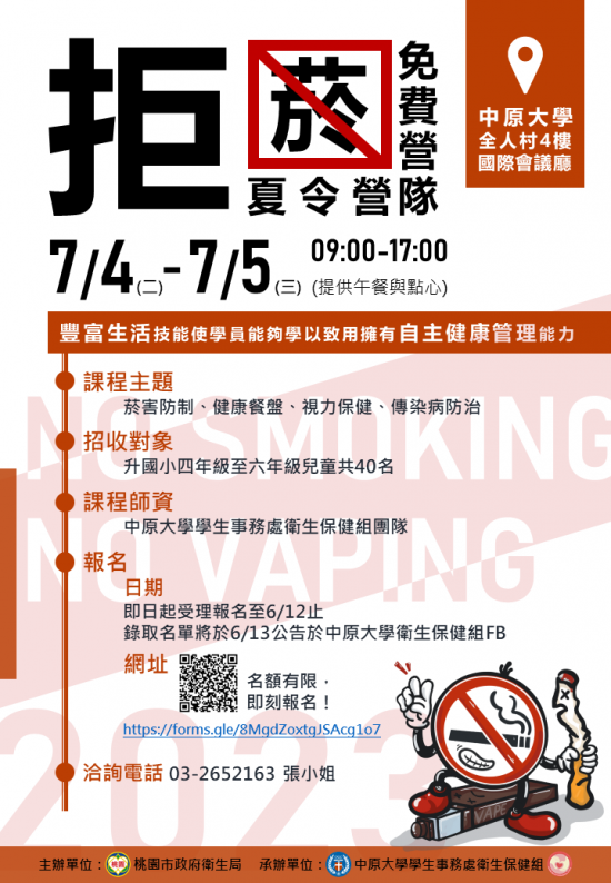 二、 為使國小學童建立正確菸害認知與拒菸識能,並將菸害防制觀念帶入家庭與社區,透過營隊活動結合菸害防制及健康教育宣導,以寓教於樂的方式, 將健康識能向下扎根,活動內容及報名方式,摘述如下: