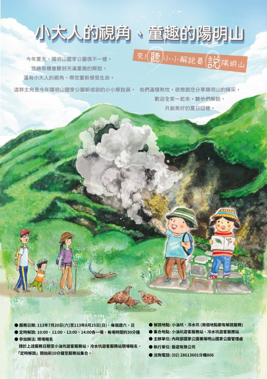 二、本活動為國小四~六年級學生經過密集培訓、反覆練習後,將於小油坑及冷水坑為遊客進行定時解說;歡迎前往參加,聽聽與大人不一樣的解說。