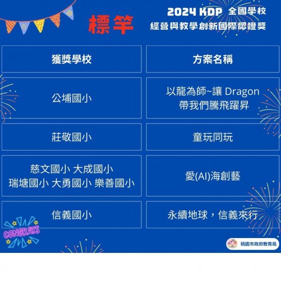 狂賀!本校國小及幼兒園 參加「2024KDP全國學校經營與教學創新國際認證獎」,榮獲「學生多元學習與效能組」<標竿>! 及「幼兒教育組」<優等>! 感謝全校老師帶領學生一起參與,讓公埔課程發展更加深耕活化。