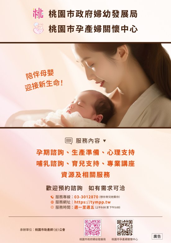 三、本案相關宣導海報業已公告於本府婦幼發展局網站(網址:https://dowcd.tycg.gov.tw/),請逕由「首頁>業務服務資訊>健康管理服務>孕產婦健康專區>孕產婦全方位守護」下載使用。