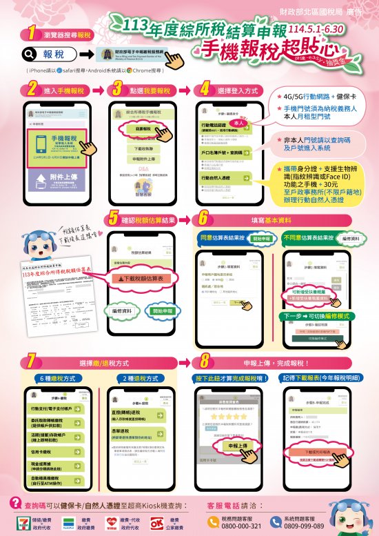 主旨: 113年度個人綜合所得稅申報期間自114年5月1日起至6月30日止,惠請貴單位將綜所稅手機報稅超貼心及手機報稅趣好禮歡樂送宣導DM(如附件)置於網站公告或寄至同仁信箱,並提醒同仁可採用手機報稅、網路線上版或稅額試算等方式如期完成申報,請查照。