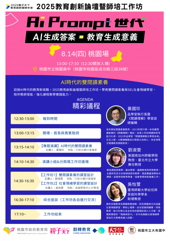 1、 | 專題演講:由黃國珍講師(品學堂創辦人)解析雙閱讀素養之發展趨勢與實務應用。 |