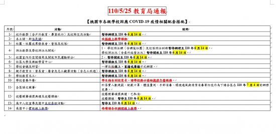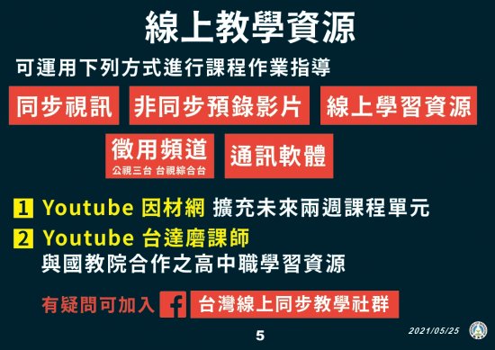 因為疫情日益嚴重,教育部宣布,全國各級學校及公私立幼兒園停止到校上課延長至 110 年 6 月 14 日(一)。