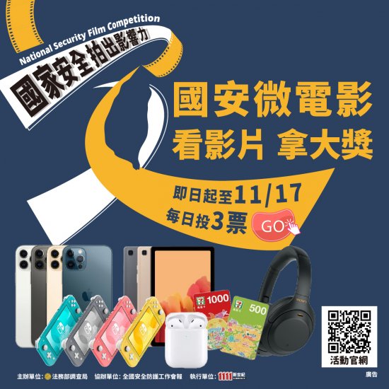 | 二、 | 為提升全民國安意識,法務部調查局舉辦「國家安全 拍出影響力」百萬微電影徵件暨網路人氣票選抽獎活動,以寓教於樂方式讓民眾瞭解維護國家安全之重要性。 |
